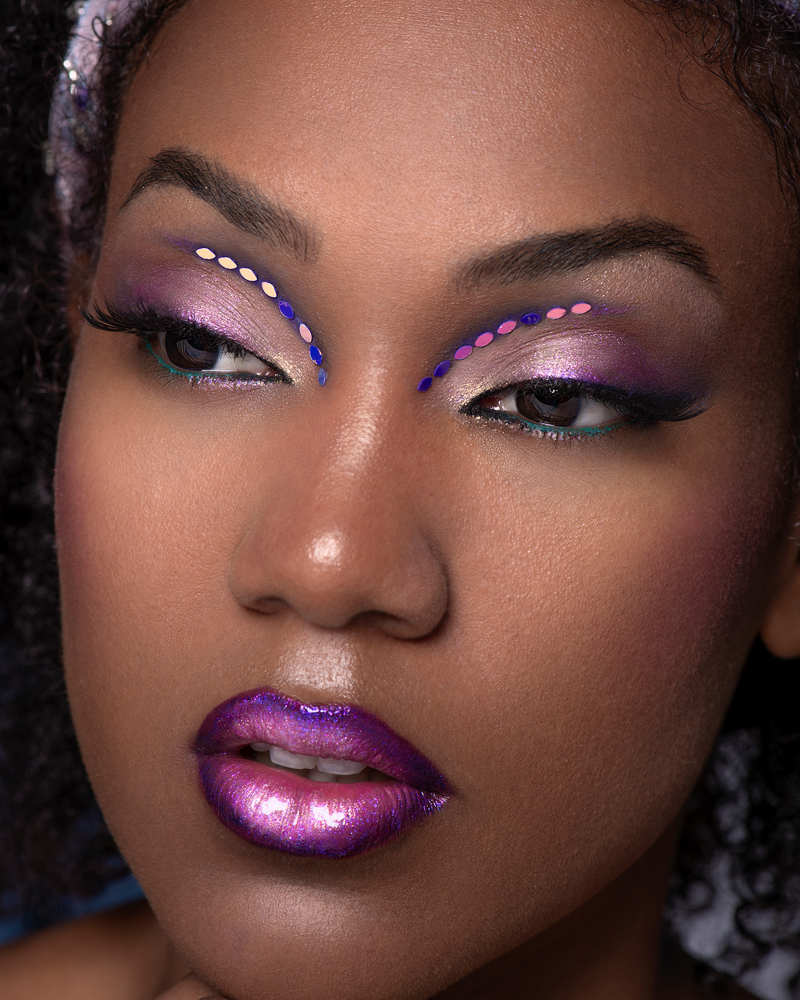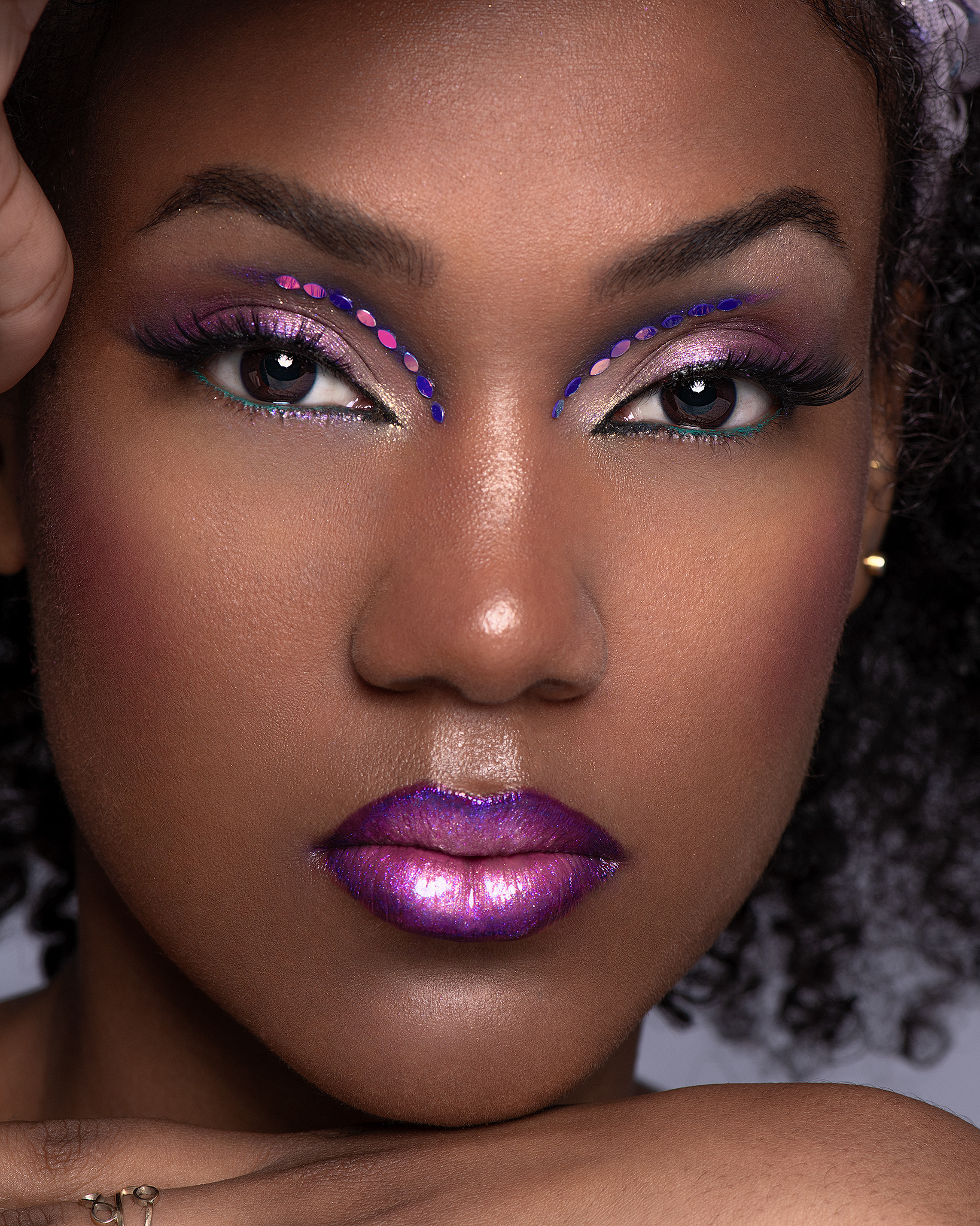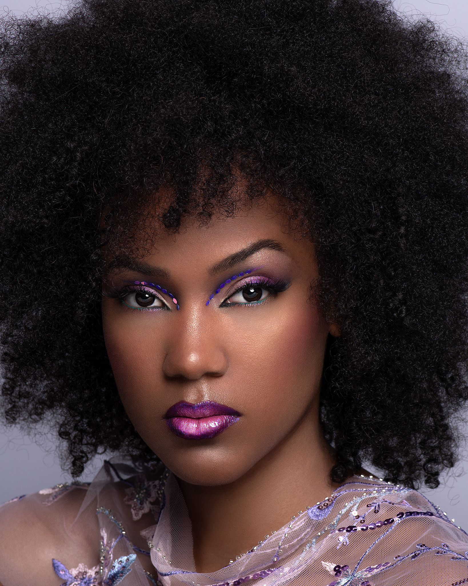 Contraste Cromático y Riqueza Tonal En esta colaboración con la modelo Yigani, exploramos la fuerza visual de los contrastes profundos. Bajo la dirección artística de Vanesa Delgado, el maquillaje apuesta por una paleta de violetas y morados intensos que se funden magistralmente con la profundidad de la piel negra de Yigani. El resultado es una estética regia y magnética que celebra la belleza en su estado más vibrante y sofisticado. El proceso de post-producción exigió una gestión del color extremadamente precisa. El reto consistió en potenciar la saturación de los pigmentos morados sin perder el detalle en las sombras ni empastar los tonos oscuros de la dermis. Se utilizó una técnica de Dodge & Burn específica para pieles ricas en melanina, resaltando los brillos naturales para dar un aspecto hidratado y lujoso, casi de terciopelo. La limpieza de las transiciones de color y la preservación de la textura original aseguran un acabado editorial que destaca por su pulcritud y su potente impacto visual. Créditos del Proyecto Fotografía y Retoque: Fco Benitez Maquillaje (MUAH): Vanesa Delgado Modelo: Yigani