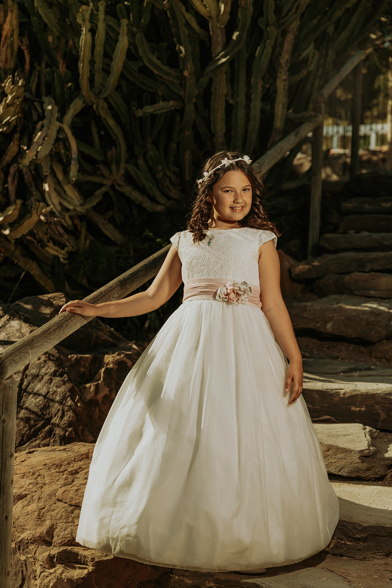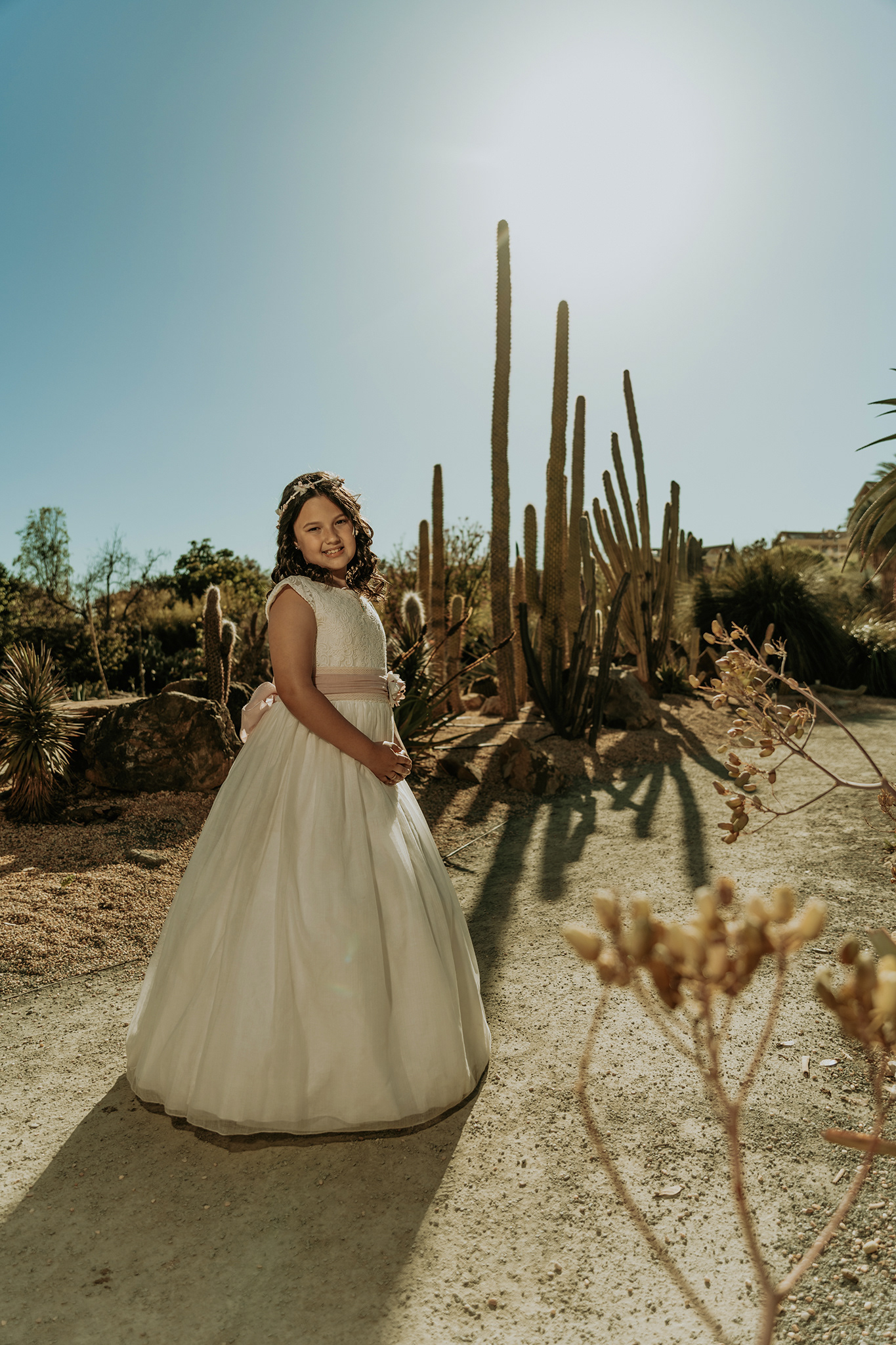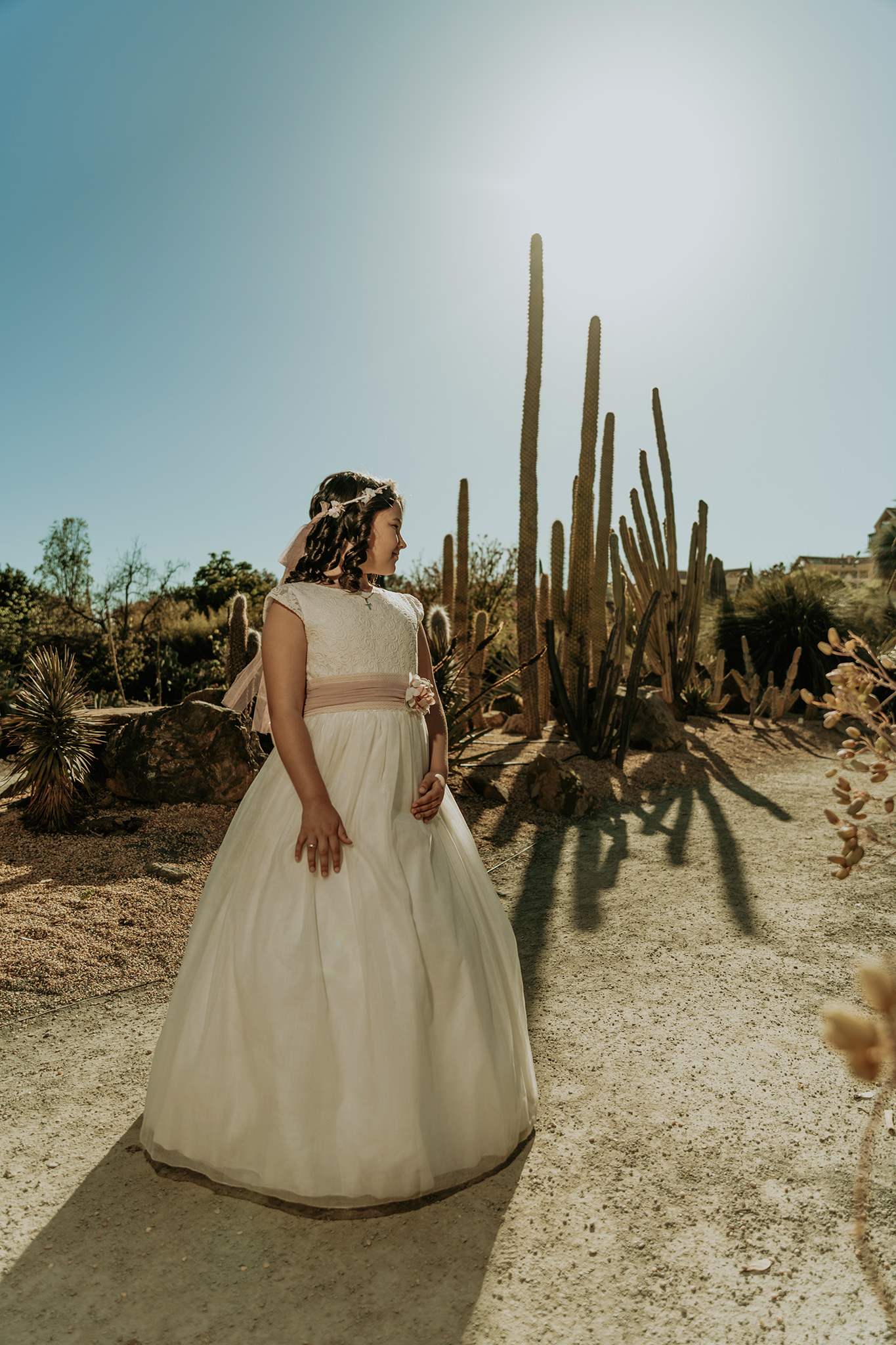 "El reportaje de Blanca en el Parque de la Paloma de Benalmádena fue un viaje entre dos mundos. Comenzamos aprovechando la luz suave y las texturas desérticas del jardín de cactus para lograr unos retratos Fine Art minimalistas, para luego adentrarnos en la frescura de los jardines principales. Esta mezcla de escenarios nos permitió jugar con diferentes paletas de color, desde los tonos tierra y pasteles hasta los verdes vibrantes, capturando la alegría y la elegancia de Blanca en un entorno lleno de contrastes."