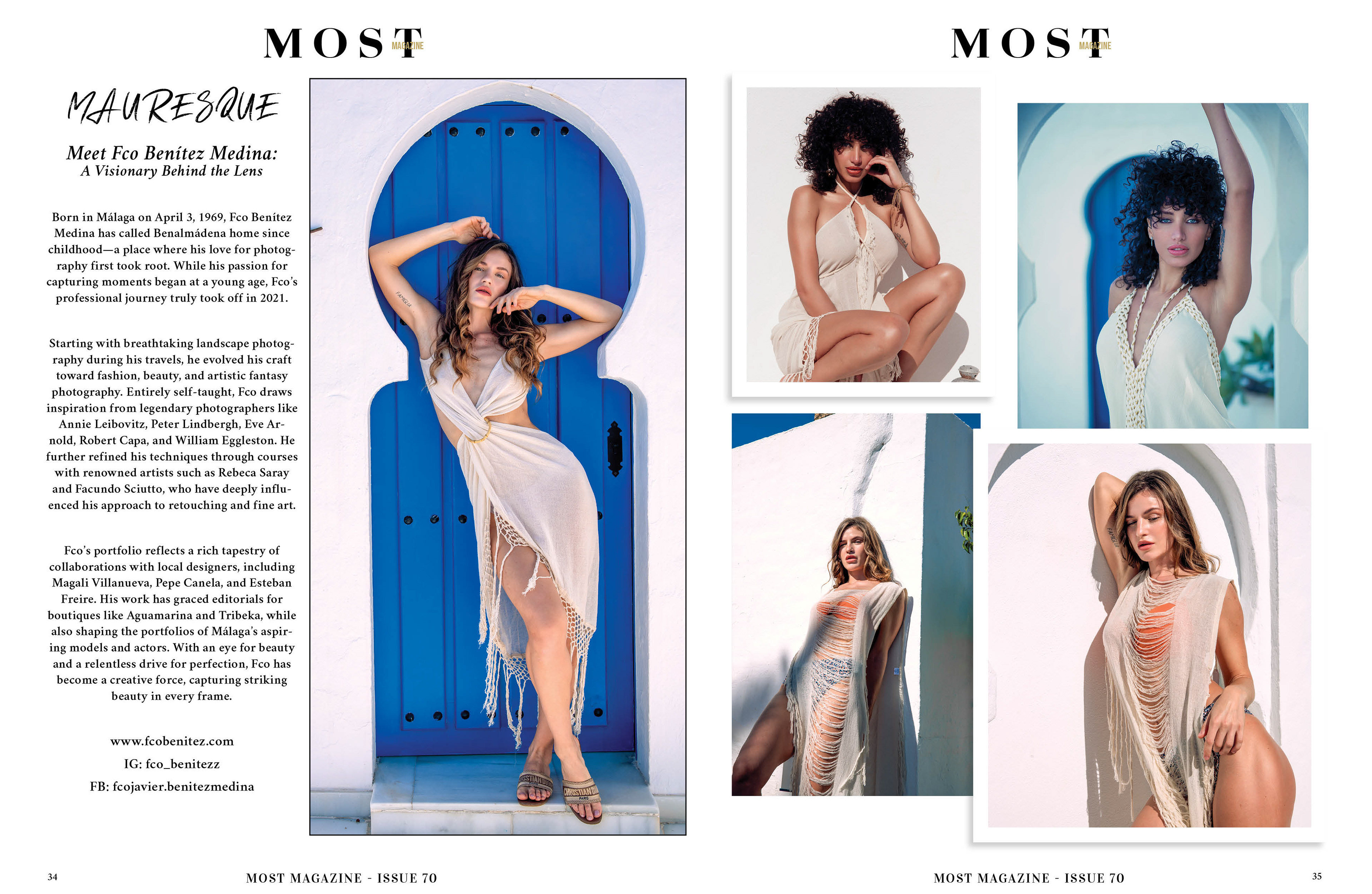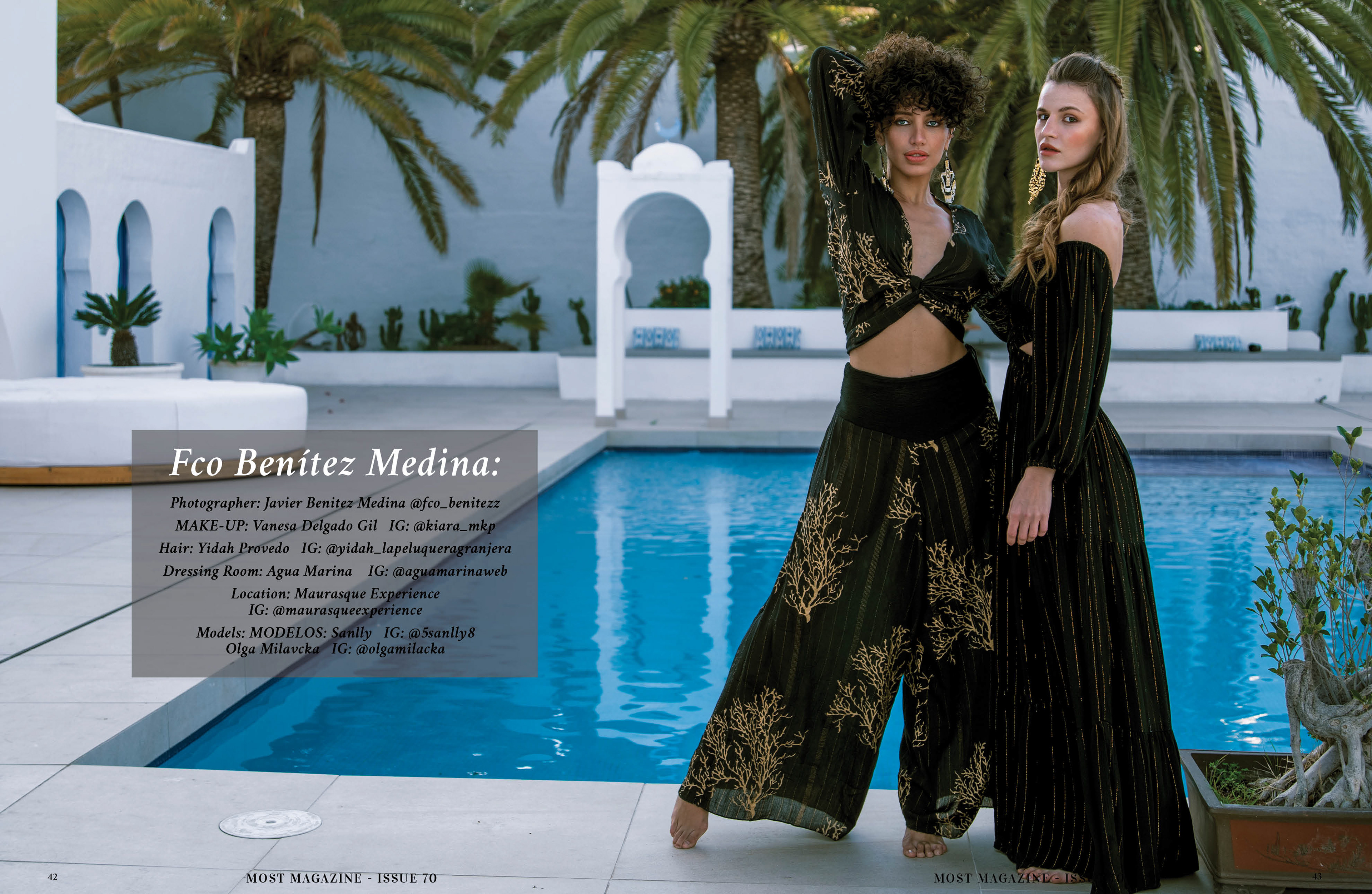 COVER STORY: VOUS Spain | Featured in: MOST Magazine Inspirada en la herencia visual de Al-Ándalus, Mauresque es una oda a la sofisticación y al exotismo atemporal. Esta producción ha alcanzado un reconocimiento excepcional, siendo portada de la revista VOUS Spain y contando con un reportaje especial en MOST Magazine, donde se destaca la trayectoria de Fco. Benítez como un "visionario tras la lente". La serie fusiona la elegancia de la moda contemporánea con la atmósfera histórica del Riad Mauresque, logrando un equilibrio perfecto entre dirección de arte, luz natural y retoque de alta gama. Créditos del Equipo: Fotografía y Edición: Francisco Benítez | @fco_benitezz Modelos: Olga Milavcka | @olgamilavcka & Sanlly | @5sanlly8 Maquillaje: Vanesa Delgado | @kiara_mkp Peluquería: Ydah Provedo | @yidah_lapeluqueragranjera Vestuario: Aguamarina | @aguamarina Localización: Riad Mauresque | @riadmauresque Publicaciones: VOUS Spain (Cover) | MOST Magazine (Special Feature)