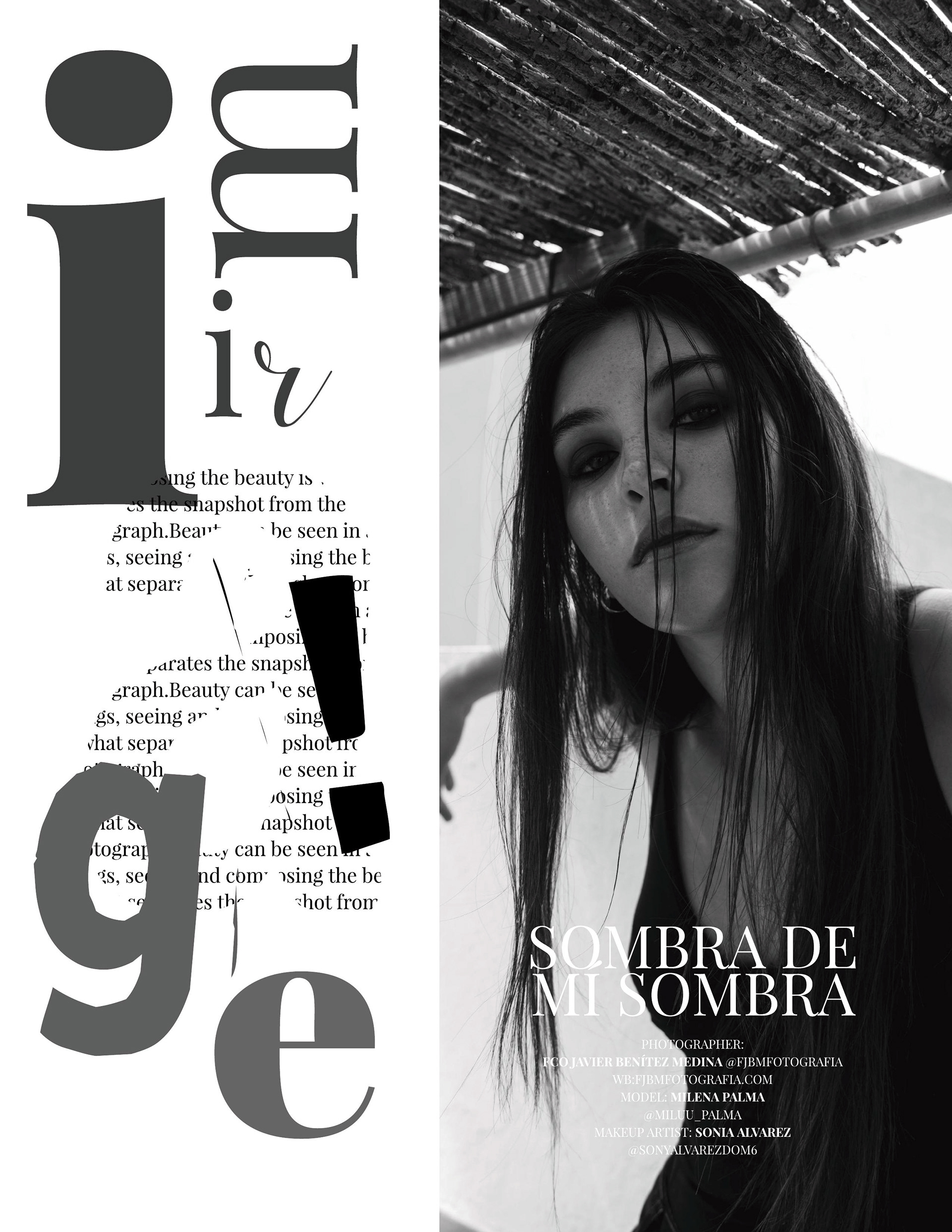 Featured in: IMIRAGE Magazine (Back Cover) "Una introspección sobre la identidad y el rastro que dejamos atrás. Publicada como contraportada en IMIRAGE Magazine, 'Sombra de mi sombra' utiliza el claroscuro para esculpir la figura y crear una narrativa de misterio y elegancia. La serie transita entre la calidez sutil de la piel en color y la fuerza gráfica del blanco y negro, explorando cómo la ausencia de luz puede revelar la esencia más pura del sujeto." Créditos del Equipo: Fotografía y Retoque: Francisco Benítez | @fco_benitezz Modelo: Milu Palma | @miluu_palma Maquillaje: Sonia Álvarez | @sonyalvarezdom6 Publicación: IMIRAGE Magazine | @imiragemagazine