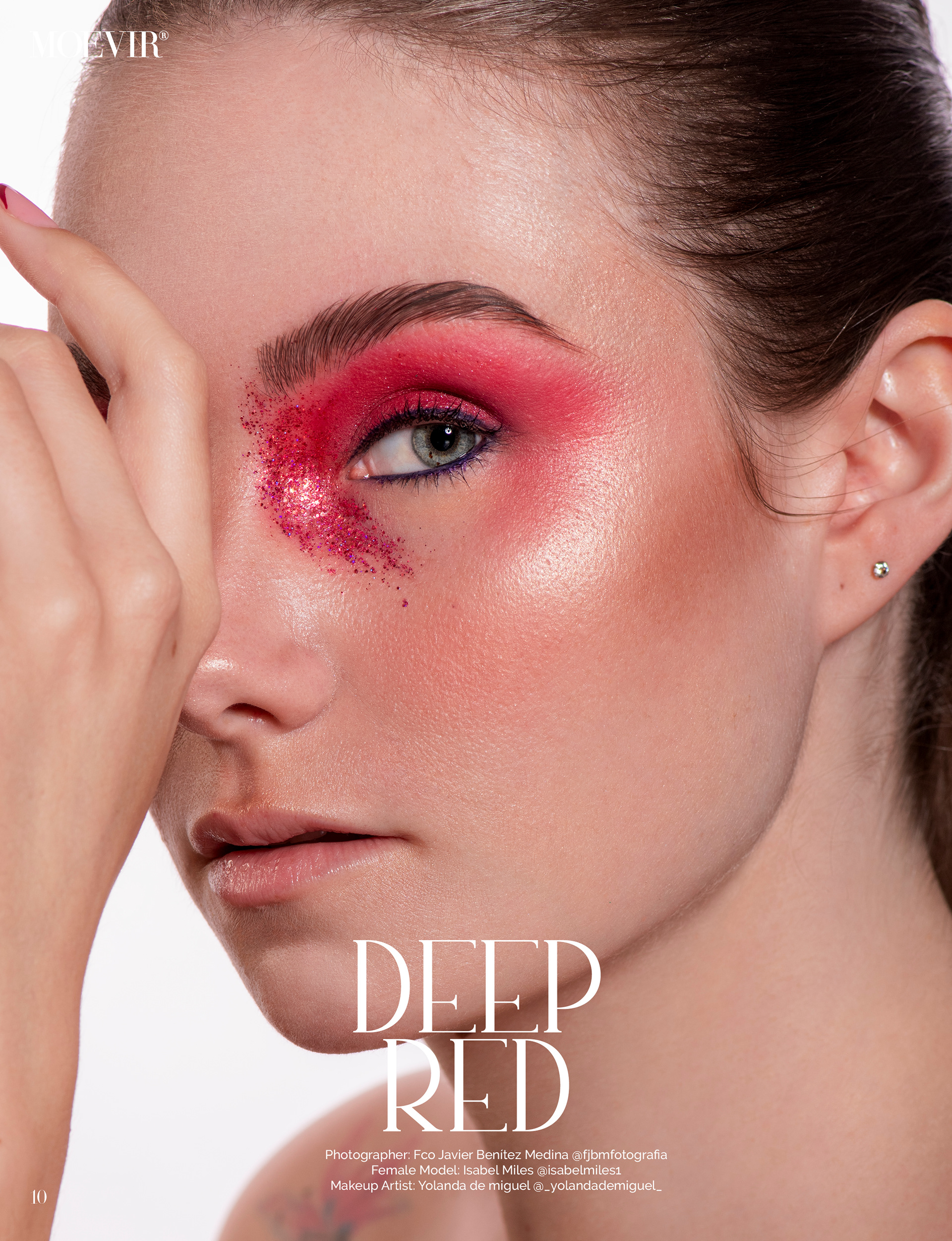 Intensidad Visual y el Arte del Detalle Bajo el título "Deep Red", esta editorial publicada en Moevir Magazine es una exploración del color en su forma más dramática y artística. Con la modelo Isabel como protagonista, la sesión gira en torno a una propuesta de maquillaje de Yolanda de Miguel donde el rojo no es solo un color, sino una textura en sí misma. A través de un degradado magistral en los ojos y la aplicación de purpurinas, la imagen transita de la sofisticación técnica a la vanguardia creativa, capturando una mirada que es a la vez feroz y elegante. En el retoque, el objetivo principal fue la gestión del micro-contraste en las texturas brillantes. Trabajar con purpurina sobre tonos rojos profundos requiere un control absoluto de la luminancia para evitar que el pigmento sature el detalle de la piel. Mediante técnicas de separación de frecuencias y un Dodge & Burn minucioso, se logró que cada partícula de brillo destaque sobre el degradado carmesí, manteniendo una piel pulida y natural. Es un trabajo que demuestra mi capacidad para manejar elementos complejos y convertirlos en una pieza editorial de alto impacto visual. Créditos del Proyecto Publicación: Moevir Magazine Título de la Editorial: Deep Red Fotografía y Retoque: Fco Benitez Maquillaje (MUAH): Yolanda de Miguel Modelo: Isabel